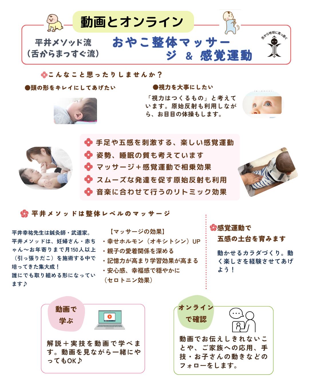 動画とオンラインで学ぶ、平井メソッド流「おやこ整体マッサージ&感覚運動」