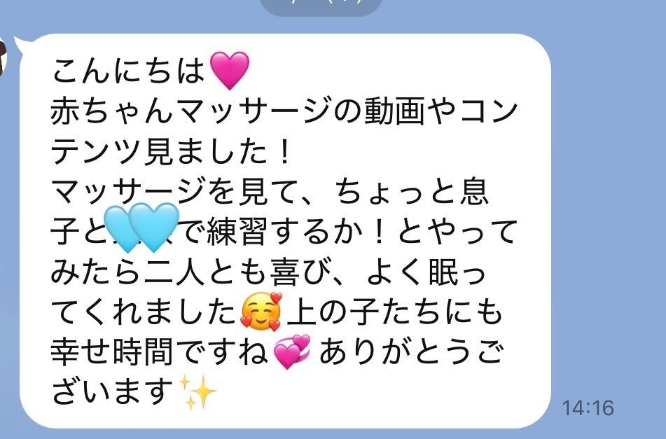 マッサージを見て、ちょっと息子と娘で練習するか!とやってみたら二人とも喜び、よく眠ってくれました♪上の子たちにも幸せ時間ですね、ありがとうございます!!